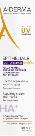 EPITHELIALE ULTRA REPAIR SPF50+ 2-in-1 herstellende crème helpt de beschadigde huid te herstellen* en biedt een zeer hoge SPF50+ zonnebescherming, met een dubbele werking tegen littekens en pigmentvlekken. Deze herstellende crème voor gezicht en lichaam bevat een gepatenteerd** herstellend complex van 3 actieve ingrediënten genaamd Cicahyalumide®, bestaande uit dipeptide, hyaluronzuur en Rhealba® haverextract. Het bevat ook Kattenklauw voor zijn ultrakalmerende eigenschappen. En om een optimale tolerantie tijdens het gebruik te garanderen, bevat het fotoprotectieve systeem slechts 4 filters in een geoptimaliseerde concentratie. Deze herstellende crème voor de beschadigde huid is ideaal om de huid dagelijks te kalmeren en te beschermen. Hij is parfumvrij en geschikt voor zowel volwassenen als kinderen, en kan meerdere keren per dag worden aangebracht op het gezicht en lichaam. Rhealba® Haver van biologische landbouw Veganistische info: geen ingrediënten van dierlijke oorsprong